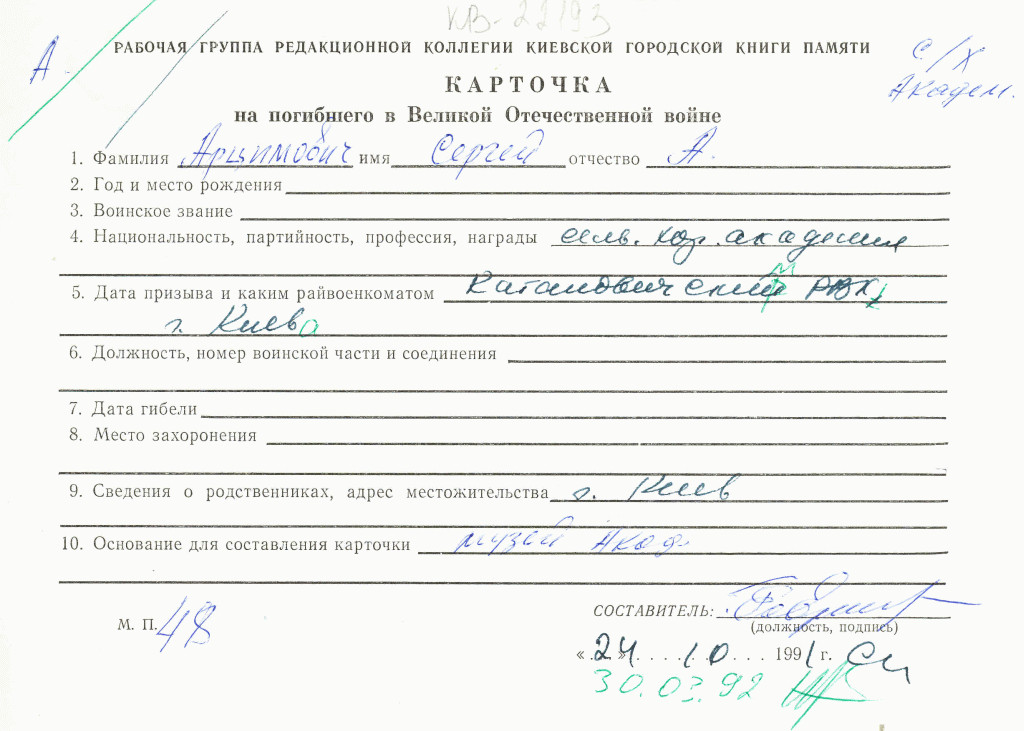 | Військкомат | Кагановицький РВК м.Київ |